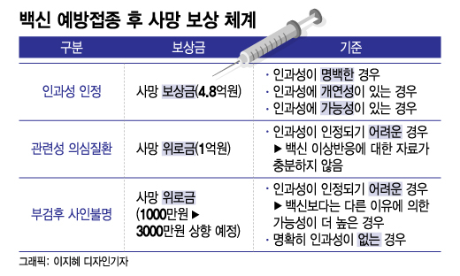 부검 후 사인불명은 사망 원인이 명확히 백신이 아닌 경우다. 예방접종이 사망을 유발한 건 아니지만 정부는 위로금 차원에서 1000만원을 지급한다. 앞으로 이 금액을 3000만원으로 올릴 예정이다.