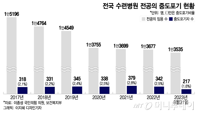 수련병원에 들어가 인턴을 하거나 전문과목을 선택해 전공의 과정을 밟고 있다가 중도에 포기하는 비율도 늘고 있다. 매년 300명 이상이 전공의 수련을 받다가 포기하고 있다. 전공의 중도 포기자 수는 2017년 318명, 2018년 331명, 2019년 345명, 2020년 338명, 2021년 379명, 지난해 342명이었다. 올해도 8월 말 기준 217명이 전공의가 되기를 포기했다. 임용됐다가 중도 포기한 경우를 비율로 보면 2017년 2.1%에서 2018년 2.2%, 2019년 2.4%, 2020년 2.5%, 2021년 2.8%로 증가세다. 지난해엔 중도 포기 비율이 2.5%였다.