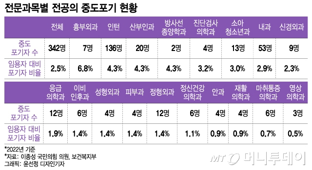 전공과목별로 보면 필수의료 분야에서 중도 포기하는 비율이 높은 경향을 보인다. 지난해 기준 전체 전공의 임용자 수 대비 중도 포기자 수 비율은 평균 2.5%다. 그런데 흉부외과의 경우 임용 대비 중도 포기 비율이 6.8%(7명)로 전체 평균 대비 2.7배가량으로 높았다. 이어 전공이 없는 인턴(4.3%, 136명), 산부인과(4.3%, 20명), 방사선종양학과(4.3%, 2명), 예방의학과(3.8%, 1명), 비뇨의학과(3.7%, 6명), 진단검사의학과(3.2%, 4명), 소아청소년과(3.0%, 13명), 가정의학과(3.0%, 18명) 등 순으로 높았다.