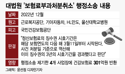 이에 근로복지공단과 기아자동차, HL만도, 울산대학교병원에서 건보공단을 상대로 '보험료부과 처분취소' 행정소송을 제기했다. 지난해 12월 대법원이 "소멸시효 3년이 지난 기간의 통상임금 추가지급분에 건보료를 부과한 건 위법하다"고 판결하면서 원고인 4개 사업장이 승소했다.