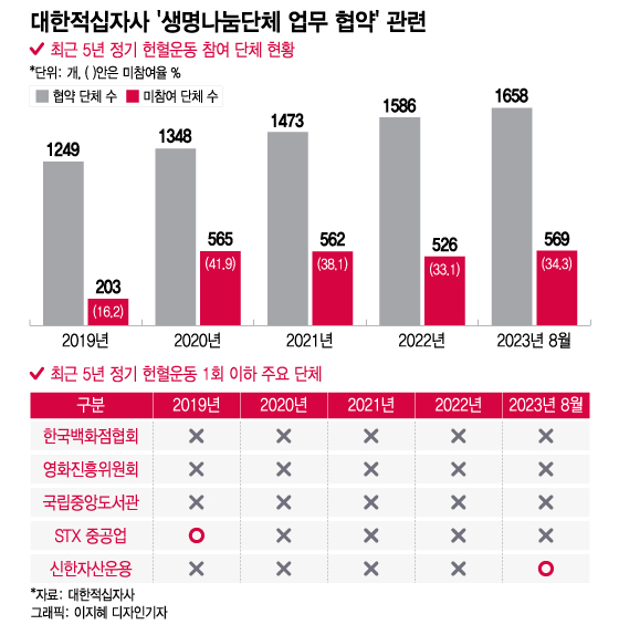 대한적십자사와 '생명나눔단체 업무 협약'을 맺은 기업·단체 10곳 중 3곳이 협약 필수사항인 정기 헌혈운동에 참여하지 않는 것으로 나타났다. 최근 5년간 정기 헌혈에 단 한 차례도 참여하지 않은 기업·단체도 147곳에 달했다. 안정적으로 혈액을 수급하고 자발적 헌혈문화를 확산한다는 '생명나눔단체 업무 협약'이 유명무실하다는 지적이 나온다.