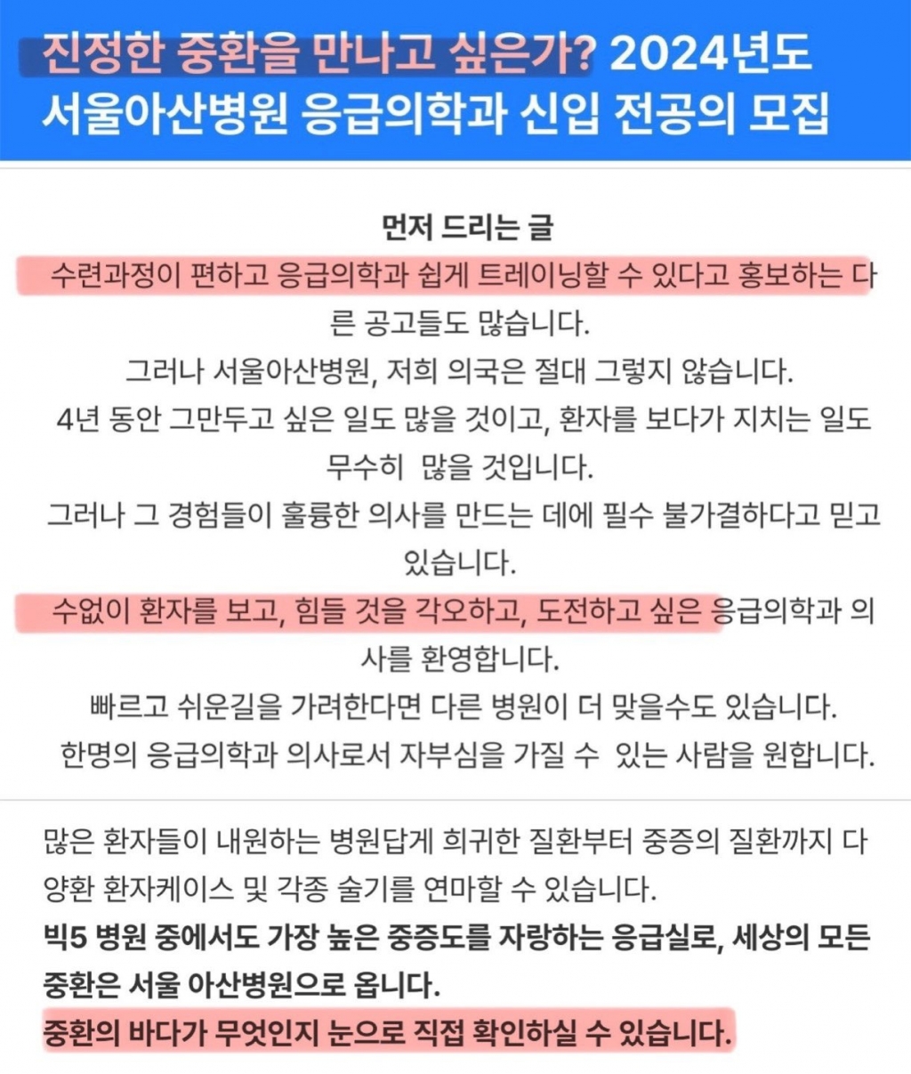 내년 상반기 전공의 모집을 앞두고 산부인과·소아청소년과 등 인원 부족에 시달리는 필수의료과가 너나없이 '의사 모시기'에 나선 가운데 서울아산병원 응급의학과의 '패기' 넘치는 공고가 화제다.
