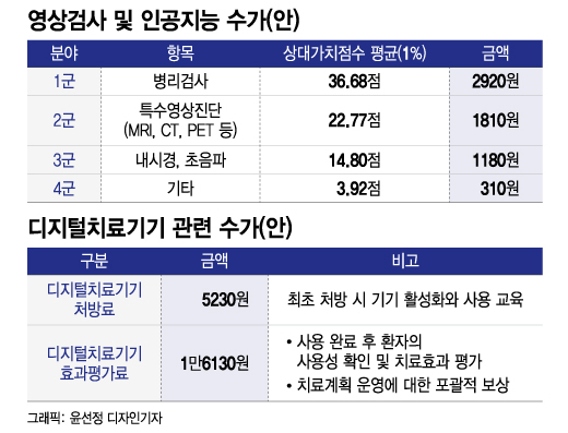 디지털 치료기기, AI(인공지능) 의료기기에 구체적인 건강보험 수가안도 마련됐다. AI 영상검사에서는 310~2920원의 별도 수가가 지급된다. 디지털 치료기기 사용료는 원가에 기반해 제품별로 가격을 결정한다. 비급여로 AI 영상검사와 디지털 치료기기를 사용하는 경우에는 분야별로 상한을 적용해 과도한 환자 부담의 발생을 방지하기로 했다. 복지부는 "이번 결정은 혁신적인 의료 기술의 현장 사용 체계를 구체적으로 마련했다는 데 큰 의의가 있다"고 설명했다.