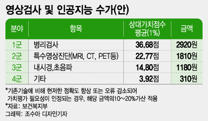 선별 급여의 '기준'이 되는 "전문의 판독료의 10% 수준"은 영상 검사 종류마다 다르다. 1군(병리 검사)은 2920원, 2군(MRI, CT, PET 등 특수영상진단)은 1810원, 3군(내시경, 초음파)은 1180원, 4군(기타)은 310원이다. 영상 검사를 할 때 영상의학과 전문의 판독료는 검사비의 10% 수준이다. 이를 통해 비급여 상한의 기준인 "영상 검사 비용의 10~30% 수준"을 계산하면 1군은 최대 87600원, 2군은 최대 54300원, 3군은 최대 35400원, 4군은 최대 9300원을 받을 수 있을 전망이다.
