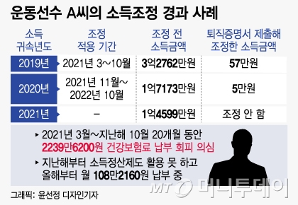 연 3억원 이상을 벌던 운동선수 A씨가 퇴직(해촉)·소득감소 등을 증명하면 건보료를 감면해주는 '소득조정신청제도'를 악용해 건강보험료 납부를 회피한 것으로 확인됐다. 노인장기요양보험료를 포함한 건강보험료 2239만6200원을 납부하지 않은 것으로 의심된다. 하지만 A씨는 추후 국세청을 통해 소득을 확인하고 건보료를 조정해 징수하는 '소득 부과 건강보험료 정산제도(소득정산제도)'가 작년 9월부터 도입된 사실을 알고 더이상 꼼수를 못 쓰게 됐다. 올해는 월 108만원가량의 건보료를 내고 있다.
