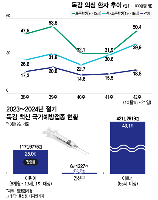 초등학생 이하(생후 6개월~13세)는 국가예방접종 무료지원사업을 통해 독감 백신을 무료로 맞을 수 있다. 질병청에 따르면 지난달 19일 기준 백신을 1회 접종받은 어린이는 117만9775명으로 접종률은 25%를 기록했다. 마 과장은 "항체 형성 시간(약 3주)을 고려해 11월 중으로 독감 백신을 맞아야 유행 확산을 예방하는 효과가 뚜렷하게 나타난다"며 "더 늦기 전에 학생을 대상으로 백신 접종을 독려하는 정부 차원의 캠패인 등 홍보 활동이 보다 적극적으로 이뤄져야 한다"고 주문했다.