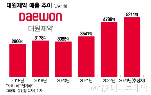 5일 제약업계에 따르면 올해 대원제약은 매출 5000억원대 제약사 반열에 오를 것으로 예상된다. 증권사들도 대원제약의 매출이 5000억원을 넘어설 것으로 보고 있다. 금융정보분석업체 에프앤가이드가 집계한 컨센서스(복수 증권사 전망치 평균) 자료를 보면 대원제약의 매출은 전년보다 8.81% 증가한 5221억원으로 추정된다.