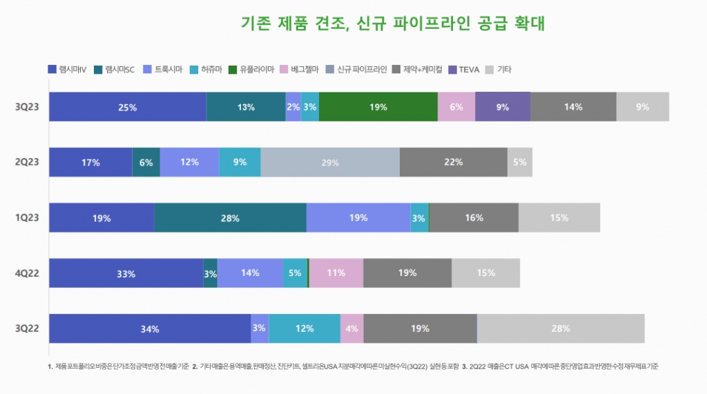 셀트리온의 호실적을 견인한 주요 품목은 자가면역질환 치료제인 램시마다. 램시마 등 주력제품이 견조한 점유율을 유지하는 가운데 램시마SC, 유플라이마 등 차세대 품목이 빠른 성장세를 보였다. 이스라엘 테바의 CMO 매출 600억원이 더해진 영향도 큰 것으로 분석됐다. 셀트리온 관계자는 "램시마IV(정맥주사)의 글로벌 점유율이 높은 수준으로 유지되면서 제품 공급이 증가했다"며 "유플라이마, 램시마SC(피하주사)의 유럽 점유율 확대, 미국 판매 본격화에 맞추어 제품 공급 증가했다"고 설명했다.