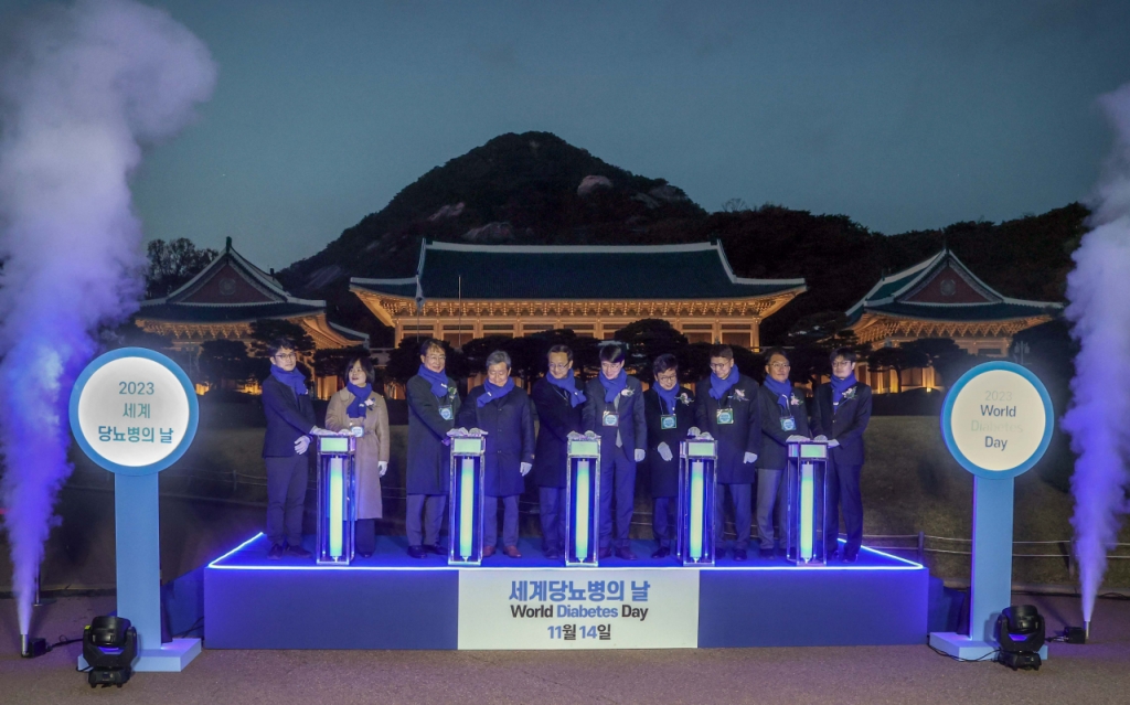 보건복지부(장관 조규홍)와 대한당뇨병학회(이사장 원규장)는 14일 세계 당뇨병의 날을 맞아 일몰 시간(오후 5시 22분)에 맞춰 서울시 종로구 청와대로에 위치한 청와대 본관 앞 대정원에서 '2023 세계당뇨병의 날 기념 당뇨병 극복을 위한 청와대 푸른빛 점등식'을 개최했다.