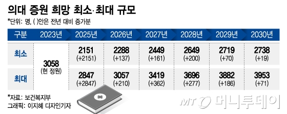 보건복지부는 21일 정부서울청사에서 브리핑을 열고 의대 입학 정원 수요조사 결과를 발표했다. 수요조사 결과 전체 의대에서 제시한 2025학년도 증원 수요는 최소 2151명에서 최대 2847명이다. 각 대학은 정원을 지속적으로 확대해 2030학년도까지 최소 2738명에서 최대 3953명을 추가 증원하기를 희망했다.
