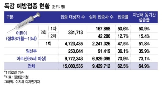 23일 질병청에 따르면 45주차(11월 5~11일) 독감 의심 환자는 1000명당 32.1명으로 유행 기준(1000명당 6.5명)의 5배 이상을 기록했다. 7~12세(1000명당 71명), 13~18세(1000명당 77명) 환자가 특히 많다. 올해는 독감 유행 주의보가 연중 내내 지속되는 이례적인 상황이 연출되고 있는데 코로나19(COVID-19)의 방역 조치로 면역력이 약해진 점이 영향을 미친 것으로 풀이된다. 일각에서는 "독감 백신을 맞아도 독감에 걸리는 건 세부 변이 차이 때문"이란 의심이 고개를 들기도 했다.