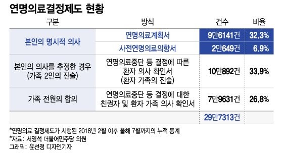 연명의료결정법에 따르면 환자가 의사를 표현할 수 없을 때 사전연명의료의향서나 연명의료계획서가 있으면 연명의료를 중단(유보)할 수 있다. 국회 보건복지위원회 소속 서영석 민주당 의원이 보건복지부로부터 받은 자료에 따르면 지난 7월 말까지 29만 7313명이 CPR, 인공호흡기 치료 등 7개 연명의료 행위를 중단(유보)하고 존엄사 했다.