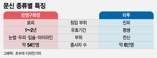 우리 국민 약 1700만명이 눈썹문신과 입술·두피문신 등 '반영구화장'과 타투를 한 번 이상 경험한 것으로 추정된다. 그런데 한국에선 이런 반영구화장과 타투가 세계에서 유일하게 '불법'이다. 시술자와 '손님' 모두 범법자가 되는 셈이다. 이를 악용한 블랙컨슈머의 협박과 갈취에 시달린다는 종사자들의 하소연도 빗발친다. 합법화해야 한다는 목소리가 커진 배경이다.