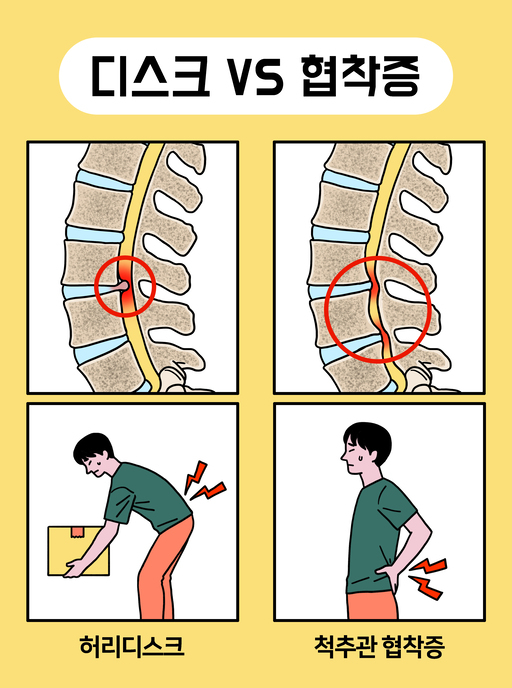 '허리디스크'라 불리는 요추 추간판 탈출증도 비슷한 증상이 나타날 수 있는데, 요추 추간판 탈출증은 디스크가 찢어지거나 흘러나오면서 증상을 일으키기 때문에 비교적 급성으로 증상이 나타난다. 하지만 척추관협착증은 수개월 또는 수년에 걸쳐 서서히 진행된 퇴행성 변화가 원인이다. 내가 언제부터 아팠는지 정확하게 표현하기 어려운 경우가 많다.