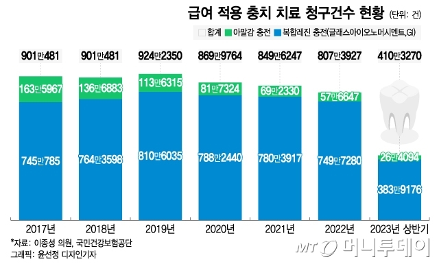 26일 이종성 국민의힘 의원이 국민건강보험공단으로부터 받은 급여적용 항목별 충치 치료 진료 현황 자료에 따르면 지난해 아말감 충전으로 충치를 치료한 건강보험 청구 건수는 57만6647건으로 5년 전인 2017년 163만5967건 대비 65% 감소했다. 올 상반기 청구건수도 26만4094건으로 감소세가 이어졌다.