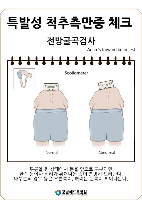 특발성 척추측만증을 빠르게 발견하기 위해서는 평소 아이의 체형과 좌우 대칭 양상 등을 꼼꼼히 살펴보는 등 무엇보다도 부모의 관심이 중요하다. 척추측만증이 있으면 양측 어깨와 골반 높이가 달라지거나 몸 양쪽의 균형이 무너지는데 이를 유심히 살펴봐야 한다. 이춘성 원장은 "무릎을 펴고 허리를 앞으로 굽혀 손끝이 땅바닥에 닿게 해 양쪽 어깨와 등, 허리의 대칭 양상을 확인하는 '전방 굴곡 검사'를 통해 가정에서도 비교적 쉽게 증상을 확인할 수 있다"고 조언했다.