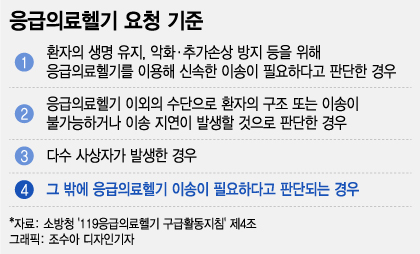 그 네 가지는 △환자의 생명 유지, 악화·추가손상 방지 등을 위해 응급의료헬기를 이용해 신속한 이송이 필요하다고 판단한 경우(1항) △응급의료헬기 이외의 수단으로 환자의 구조 또는 이송이 불가능하거나 이송 지연이 발생할 것으로 판단한 경우(2항) △다수 사상자가 발생한 경우(3항) △그 밖에 응급의료헬기 이송이 필요하다고 판단되는 경우(4항)다.