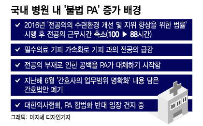 PA는 주로 전공의가 부족한 '기피 과'에서 의사 대신 봉합·절개·처방 등을 담당한다. 원래는 미국식 제도로서 우리 의료법 체계에선 규정돼 있지 않다. 2016년 '전공의의 수련환경 개선 및 지위 향상을 위한 법률'이 시행되면서 전공의의 주당 근무 시간이 100시간에서 88시간으로 줄었고, 이에 따라 병원 현장을 지키는 의사 인력이 부족해졌다. 하지만 수도권 병상은 증가해 의료 현장에서 전공의의 빈 자리를 대체할 PA 수요가 높아졌다.