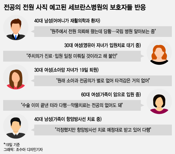 강원도 원주에서 어머니의 뼈 조직검사를 받기 위해 이날 상경했다는 40대 남성 A씨는 "병원을 옮겨야 하나 알아보고 있다. 불안하다"며 불편한 기색을 내비쳤다. 그는 "원주기독병원(강원도 원주)에서 정밀검사를 권유하면서 해당 병원엔 검사 장비가 없으니 서울의 세브란스병원으로 전원할 것을 의뢰해줬다"이라며 "어머니가 세브란스병원 정형외과에서 1차 검사 후 2차로 오늘 조직검사를 받는데, 그 결과에 따라 입원해 수술받아야 할 수도 있다. 이런 상황에서 전공의들이 모두 사직한다고 해서 다른 병원을 알아볼까 한다"고 토로했다.