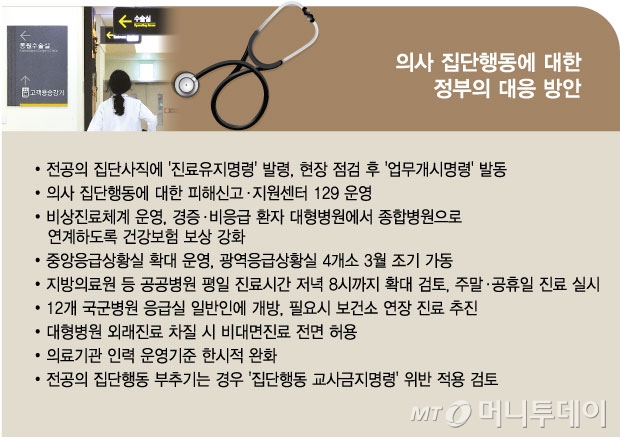 '빅5' 병원을 비롯한 전공의들의 집단행동이 가시화하면서 정부가 유감을 표하며 전공의들에 현장을 지켜줄 것을 당부했다. 정부는 전공의들의 집단사직으로 인한 의료공백에 대응해 전공의들에 '진료유지명령'을 발령했다. 의사 집단행동에 대한 피해신고·지원센터도 운영하기로 했다. 의료공백으로 상급종합병원의 외래진료에 차질이 빚어질 경우 현재 의원급에 한정된 비대면진료를 전 의료기관으로 확대해 전면 허용할 방침이다. 국군병원 응급실을 일반인에 개방하고 공공병원 진료 시간을 확대하는 등으로 진료공백을 최소화할 계획이다.