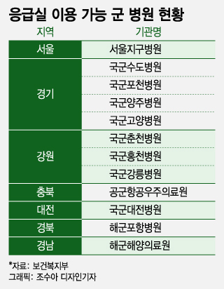 한편 복지부는 22일 '응급실 이용 가능 군병원 목록'을 공개했다. 복지부 정통령 공공보건정책관은 "전국 15개 군병원 가운데 응급실을 이용할 수 있는 12곳을 추린 것"이라며 "119를 통해 이송되는 경우가 많긴 하지만 일반 국민도 직접 이들 군병원 응급실에 내원해 진료받을 수 있다"고 했다. 하지만 그중 유일한 서울 소재인 국립서울지구병원의 경우 내비게이션에서 검색되지 않고 있다. 이에 대해 정 정책관은 "나무위키에서 주소가 검색되긴 하지만 일반 국민에게 개방된 만큼 지금보다 주소 검색 등 편의성을 높일 수 있는 방안을 강구하겠다"고 말했다.