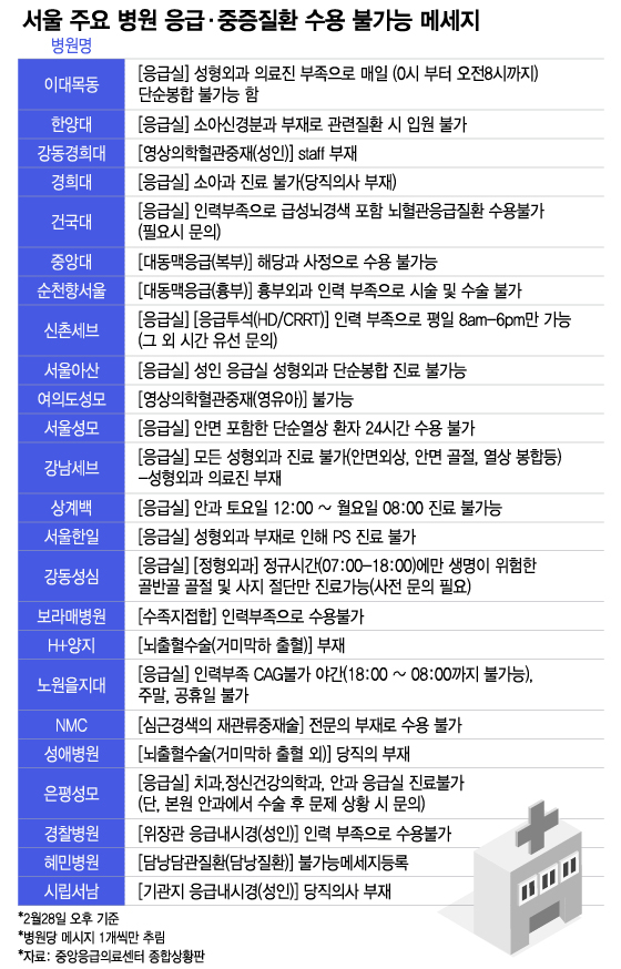 28일 본지 단독 취재에 따르면 이날 오후, 서울에서 응급실을 가동하는 병원 가운데 24곳이 '응급환자와 중증질환 환자를 수용할 수 없는 상태'인 것으로 확인됐다. 이들 24곳이 이날 띄운 '수용 불가능' 메시지는 모두 합해 96개였는데, 그중 응급·중증 환자를 받지 못하는 사유에는 '의사 부족'이 45개(47%)로 절반에 가까웠다. 응급실에서 퇴짜를 맞는 사유 둘 중 하나는 의사가 없기 때문이라는 것이다.