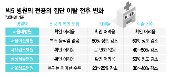 머니투데이가 4일 빅5 병원(서울대·세브란스·서울아산·삼성서울·서울성모병원)에 전공의 복귀 현황과 입원률·수술건수 변화 여부에 대해 문의한 결과, 전공의 복귀 움직임은 없거나 미미한 수준이고, 입원율과 수술률 모두 많게는 50%까지 줄어든 것으로 나타났다.