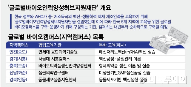 앞서 복지부는 2022년 'WHO 글로벌 바이오 인력양성 허브'를 설립했다. WHO(세계보건기구)가 중저소득국가의 백신·생물학적 제재 제조 인력 교육을 제공하는 국가로 한국을 지정한 데 따른 것이다. WHO는 코로나19 팬데믹(감염병의 대유행)으로 백신 불평등 문제가 불거지고 지역별 백신 생산 필요성이 대두되면서 글로벌 바이오 인력양성 허브 설립을 추진했다. 교육 대상자는 주로 중저소득국 바이오·백신 인력이며 전체 교육 인원의 20%는 한국 교육생들이다.