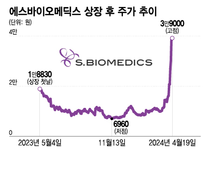 상장 첫날 18.66% 하락한 주가로 시작한 에스바이오메딕스 주가는 이후 꾸준히 하락을 지속하며 지난해 11월 7000원 이하까지 떨어진 뒤 최근 상승세 시작 전까지 힘을 쓰지 못해 왔다. 회사 측은 최근 급등세가 임상 결과 기대감에 기인한 만큼 내달 데이터 확보에 집중하고, 결과를 투명하게 공개한다는 계획이다.