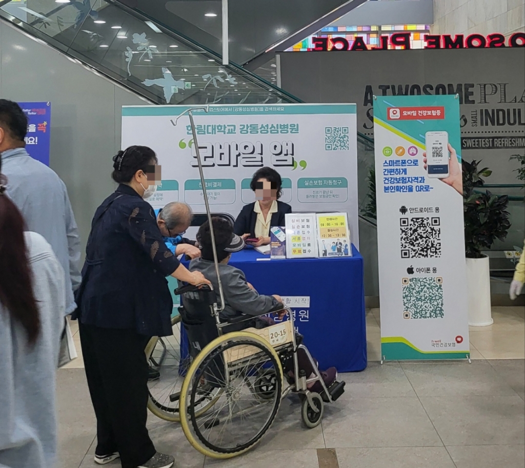 신분증을 갖고 오지 않은 어르신은 창구 직원으로부터 모바일 건강보험증 설치를 안내받았다. 보건복지부에 따르면 건강보험증, 주민등록증, 운전면허증과 같은 실물 신분증이 없어도 모바일 건강보험증이나 공동인증서, 간편인증(PASS, 네이버·카카오 인증서 등) 등 스마트폰으로 본인 확인이 가능하다. 하지만, 주요 환자층인 노인들은 스마트폰을 다루기 어려워하는 경우가 많아 실효성은 미미해 보였다. 강동성심병원은 환자 편의를 위해 자체적으로 앱 설치 부스를 마련했는데, 모바일 건강보험증 앱을 설치하려는 노인 환자들이 길게 줄을 섰다.