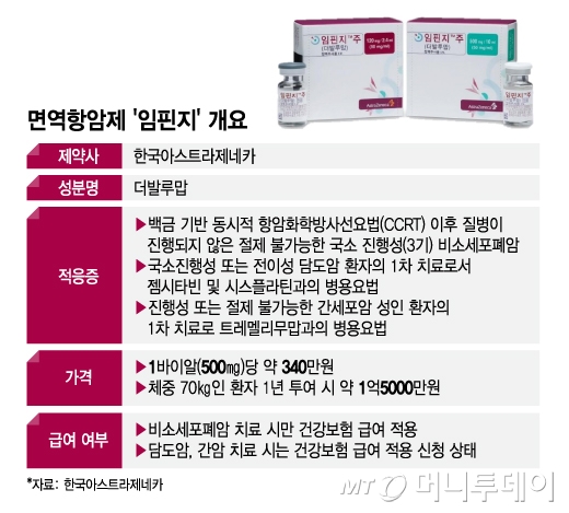 임핀지는 △백금 기반 동시적 CCRT(항암화학방사선요법) 이후 질병이 진행되지 않은 절제 불가능한 국소 진행성(3기) 비소세포폐암 △국소진행성 또는 전이성 담도암 환자의 1차 치료로서 젬시타빈 및 시스플라틴과의 병용요법 △진행성 또는 절제 불가능한 간세포암 성인 환자의 1차 치료로 '트레멜리무맙'과의 병용요법으로 쓰일 때 치료효과가 인정됐다. 현재 비소세포폐암 치료시엔 급여가 적용되지만 담도암과 간암 치료시엔 비급여라 환자가 비용전액을 부담해야 한다.