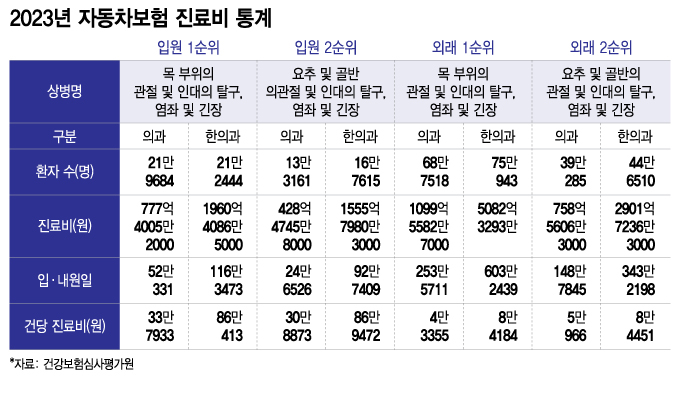 이에 대해 대한의사협회(의협)은 전날(24일) 보도자료를 내고 "2023년 자동차보험 진료비 통계만 봐도 의과(양방)와 한의과의 자동차보험 진료 불균형의 심각성이 적나라하게 드러났다"며 "자동차보험 환자에 대한 한의과 진료가 비정상적으로 급증한 것"이라고 분석했다.