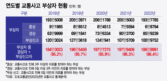 한의협은 경상환자(경상자·부상신고자)의 비율에 주목해야 한다는 입장이다. 지난해 도로교통공단이 발표한 '2023년 판 교통사고 통계 분석'에 따르면 교통사고 부상자 가운데 경상자(5일 이상 3주 미만의 치료 필요)와 부상신고자(5일 미만 치료 필요) 총인원은 186만8991명으로, 전체 교통사고 부상자의 96.4%에 달했다. 이를 근거로 한의협은 "경상 환자의 경우, 표면적인 외상이 두드러지지 않아도 '의료기기를 이용한 검사'를 통해 확인할 수 없는 연부조직의 이상 등으로 지속적인 통증을 호소하는 경우가 많다"며 "사고 이전의 상태로 회복되길 바라는 경상 환자들이 한의 진료를 더 선호하는 이유"라고 주장했다.
