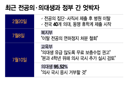 정부가 당근을 제시했는데도 복귀하지 않으려는 작전은 의대생과 전공의가 '닮은꼴'이다. 정부는 앞서 지난 8일, 복귀 여부와 관계없이 모든 전공의에 대해 면허정지 처분을 철회한다고 밝혔다. 또 9월부터 수련을 다시 받으려는 사직 전공의의 경우 '사직 후 1년 내 동일 연차·전공으로 복귀할 수 없다'는 전공의 수련 규정에 특례를 적용해 다른 병원에서 수련할 수 있게 했다.