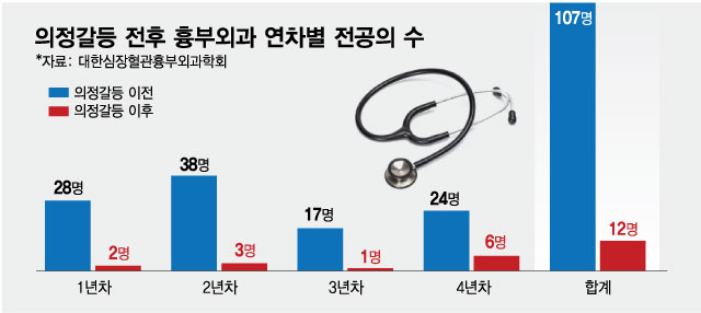 흉부외과가 '기피과 중의 기피과'란 오명(汚名)을 입은 가운데, 그나마 명맥을 이은 전국 흉부외과 전공의 107명 중 현재 고작 12명만 병원에 남은 것으로 확인됐다. 지난 2월 의정갈등 발발 이후 사직서를 내고 대거 병원을 떠나서다. 병원을 지키는 흉부외과 전공의마저도 절반인 6명이 최고참인 4년차로, 내년 배출될 신규 전문의는 많아야 6명에 불과할 것으로 예고된다.
