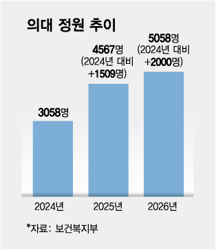 게다가 2026년도부터 의대정원이 정부의 정책 원안대로 현재보다 2000명 더 늘고, 2026년도 국시에 본과 4학년생의 약 5%만 응시한다고 가정하더라도 신규 의사 수는 예년보다 줄어들 전망이다. 의대정원은 현재보다 65% 느는데(3058→5058명), 신규 의사 수는 예년보다 88% 이상 줄어들어서다. 현재 전국 의대생(1만8793명)의 48.5%인 9109명이 휴학계를 내고 돌아오지 않고 있는데, 이는 내년뿐 아니라 2026학년도 의사 국시에 의대생의 응시율이 저조할 가능성이 적잖다는 대목으로 읽힌다.