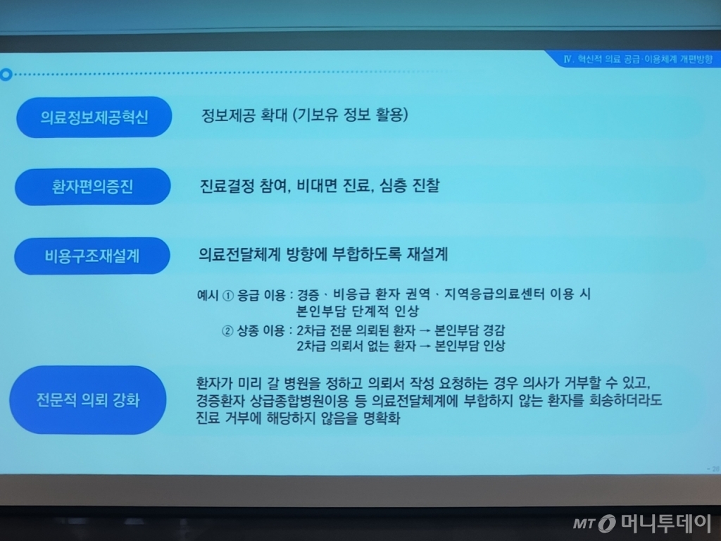 정부는 우선 경증·비응급 환자의 상급종합병원 이용 문턱을 높이기로 했다. 유 과장은 "경증·비응급 환자가 권역·지역응급의료센터를 이용 시에 본인부담분을 단계적으로 인상하는 작업을 착수하고 있다"며 "2차급에 전문적으로 의뢰된 환자는 본인부담을 경감하는 방안, 2차급 의뢰서 또는 산정특례 질환처럼 중증 소견에 의뢰서가 없는 환자에 대해서는 본인부담을 인상하는 방안 이 두 가지를 가져가는 것을 검토 중"이라고 밝혔다. 본인부담 인상안은 전체 병원에 적용할 계획이고 본인부담 경감안은 시범사업 참여 병원을 대상으로 하는 안을 구상 중인데 규정을 바꿔야 해 아직 시행 시기는 미정이다.