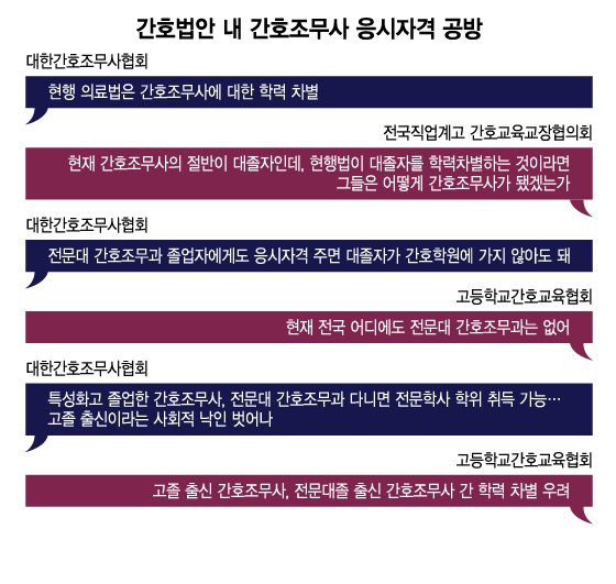 하지만 특성화고 간호과 교사들의 생각은 다르다. 김희영 고등학교간호교육협회장은 "특성화고 간호과, 간호학원이 있는데 굳이 전문대까지 진학해 비싼 수업료를 내고 간호조무사 자격증을 따려는 사람이 있을까"라며 "간호조무사협회는 '학력 제한 철폐'라는 꽤 그럴듯한 구호를 정의로운 칼처럼 휘두르고 있다. 그 칼끝이 특성화고 간호과 학생들을 향하고 있다는 것을 진정 모르는 것인가"라고 반문했다. 전문대에 간호조무과가 생기면 '특성화고 간호과 출신'과 '전문대 간호조무과 출신' 간호조무사에 대한 급여가 차이 날 것이고, 특성화고 출신 간호조무사는 학력 차별을 당할 것이란 게 이들의 주장이다.