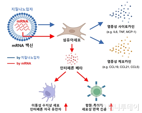 연구진은 주사부위에서 지질나노입자로 인해 염증성 사이토카인과 케모카인 유전자 발현이 증가해 초기 면역증강 효과가 유도되는 것을 확인했다. 주입된 mRNA 분자는 인터페론 베타 유전자 발현을 통해 접종부위, 림프절의 이동성 수지상세포의 활성화를 돕는다. 백신에 의한 세포성 면역반응을 증진하는 것도 확인했다. 이번 연구는 mRNA 분자와 지질나노입자 자체에 의해 활성화되는 초기 면역반응 경로, 작용 메커니즘에 대한 통찰을 얻는데 기여했다는 평가다.