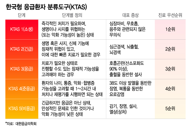 하지만 KTAS가 환자를 경증이냐 중증이냐로 나누는 정확한 기준이 될 수는 없다는 게 응급의학과 의사들의 주장이다. 이형민 대한응급의학의사회장은 4일 기자와의 통화에서 "4~5등급을 경증·비응급으로 분류하는 게 틀린 건 아니지만 그렇다고 100% 다 맞는 것도 아니"라고 언급했다. 이 회장은 "응급실에서 환자를 처음 봤을 때 (당장 처치가) 급한지 아닌지 정도만 분류하려는 기준"이라며 "처음에 4등급이었다가 진료 후 2등급으로 바뀌는 경우도 부지기수"라고 설명했다. 같은 환자여도 적용 시점에 따라 KTAS 등급이 달라질 수 있단 얘기다.