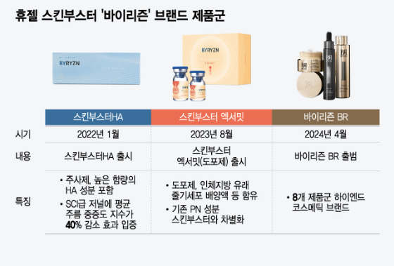 이를 통해 바이리즌 출범 첫해 높은 함량의 HA(히알루론산) 성분을 함유한 주사제 '바이리즌 스킨부스터HA'를 출시했고 이듬해 주사제가 아닌 도포 형태의 '스킨부스터 엑세밋'을 제품군에 추가했다. 올해는 4월 이를 기반으로 한 프리미엄 화장품 브랜드 '바이리즌 BR'까지 출범하며 영역을 확대했다.