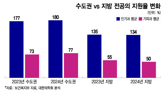 12일 대한의학회에 따르면 정부는 당초 수도권과 비수도권의 전공의 정원 비율을 5대 5로 정했지만, 대한의학회가 강하게 반발한 끝에 일단 5.5대 4.5로 조율돼 올해 상반기 전공의 모집 때 반영됐다. 하지만 지방의 기피·필수의료과(내과·산부인과·응급의학과 등)의 경우 오히려 지원율이 지난해 55%(정원 대비)에서 올해 50%로 줄었고, 지방 인기과는 135%에서 134%로 높은 인기를 유지했다.