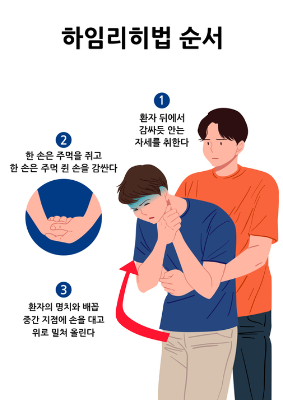 음식물 목에 걸려 기도가 막힐 경우, 복부 압박해 배출시킬 수 있는 '하임리히법' 숙지 도움