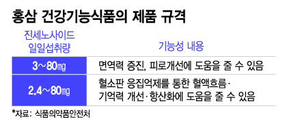 4조1695억원대 규모(2022년 생산실적 기준)의 국내 건강기능식품 시장에서 가장 많이 사용되는 기능성 원료인 홍삼(9848억원)도 사정이 다르지 않다. 홍삼은 유효성분인 진세노사이드(Rg1·Rb1·Rg3)를 얼마나 많이 먹느냐에 따라 기대할 수 있는 건강 효과가 다르다. 식약처는 진세노사이드의 일일섭취량이 3∼80㎎이면 '면역력 증진·피로 개선에 도움을 줄 수 있음'이라는, 2.4∼80㎎이면 '혈액흐름· 기억력 개선·항산화에 도움을 줄 수 있음'의 기능성 문구를 제품에 사용할 수 있게 허용했다. 홍삼 건강기능식품 중에서도 함량에 따라 쓸 수 있는 기능성 문구가 다른 것이다.