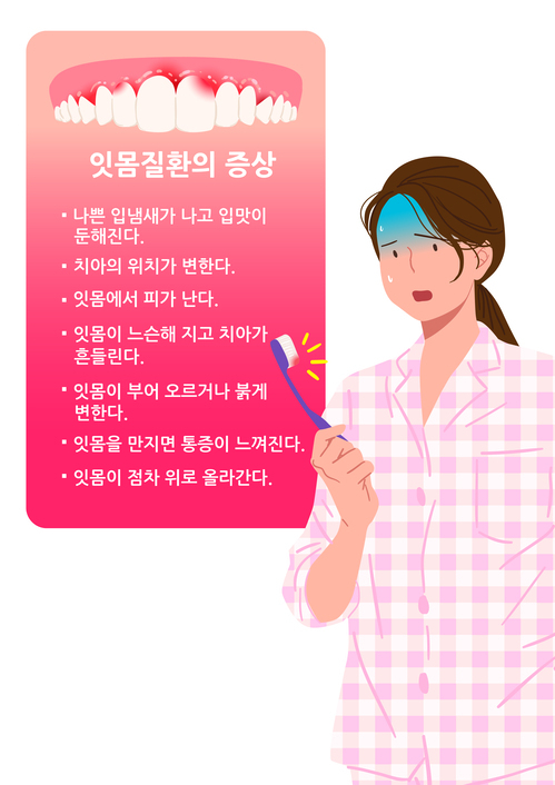 양치할 때, 침을 뱉을 때 피가 비치면 잇몸병을 의심할 수 있다. 이 밖에도 △잇몸에서 피가 난다 △잇몸이 빨갛게 변하거나 붓는다 △잇몸이 주기적으로 들뜨고 근질거린다 △이와 이 사이가 벌어지고 음식물이 많이 낀다 △잇몸이 내려가 점점 치아가 길어 보인다 △나쁜 입 냄새가 난다 △흔들리는 치아가 있다 등 증상이 있다면 잇몸병이 있는지 확인해야 한다.