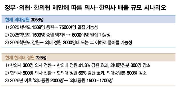 이 방안이 현실화하면 한의사 최대 500명이 매년 한의사 면허를 내려놓고 의사가 되는 건데, 이는 사실상 한의대 정원을 절반 이상 줄이는 셈이나 마찬가지란 분석이 나온다. 현재 한의대 정원이 연간 725명이므로, 300명이 의사로 전환되면 지금보다 41.3%(300명 감원), 500명이 전환되면 69%를 감원하는 효과나 다름없어서다.