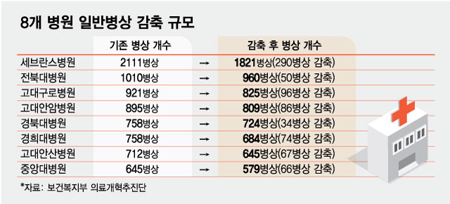 이들 병원은 먼저 중환자실, 특수병상, 소아·고위험분만· 응급 등 유지·강화가 필요한 병상을 제외한 나머지 일반병상을 줄일 예정이다. 세브란스병원은 2111병상에서 1821병상으로(290병상 감축) 8개 병원 중 병상을 가장 많이 줄일 예정이다. 이어 고대구로병원(921→825병상)과 고대안암병원(895→ 809병상), 경희대병원(758→ 684병상) 순으로 병상을 많이 감축한다.