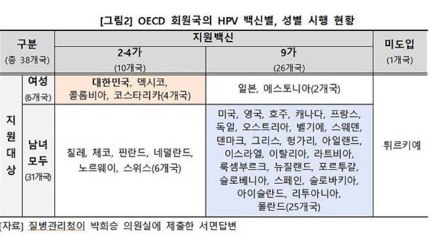 한국과 달리 선진국들은 남녀 모두에 HPV 백신 접종을 지원한다. 경제협력개발기구(OECD) 가입국 38개국 중에서도 82%에 해당하는 31개국이 남녀에 HPV 백신 접종을 지원한다. 호주는 2013년 남녀 모두에 HPV 백신 접종을 지원했고 그 덕에 HPV 관련 질환의 남성 유병률이 2배 이상 감소했다.
