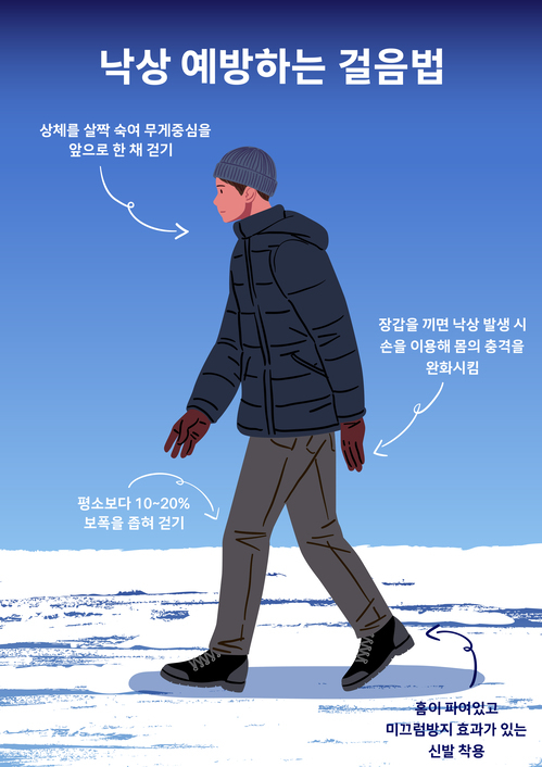 넘어져도 고관절이 부러지지 않으려면 골밀도가 높아야 한다. 골다공증을 막는 4가지 생활수칙이 있다. 첫째, 안전사고에 유의해야 한다. 겨울철 얼어붙은 빙판길을 걸을 때는 평소보다 걸음 속도와 폭을 10% 이상 줄이는 것이 안전하다. 주머니 속에 손을 넣고 걸으면 균형을 쉽게 잃어 낙상 사고로 이어질 수 있으니 주의하고, 지팡이·보조기구를 활용하는 것도 방법이다.