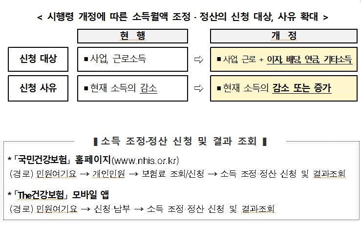 이번 개정으로 조정·정산의 대상이 되는 소득은 2종(사업·근로소득)에서 6종(사업·근로·이자·배당·연금·기타소득)으로 확대되고, 전년보다 현재 시점의 소득이 감소한 경우뿐 아니라 증가한 경우에도 조정·정산 신청이 가능하게 된다.